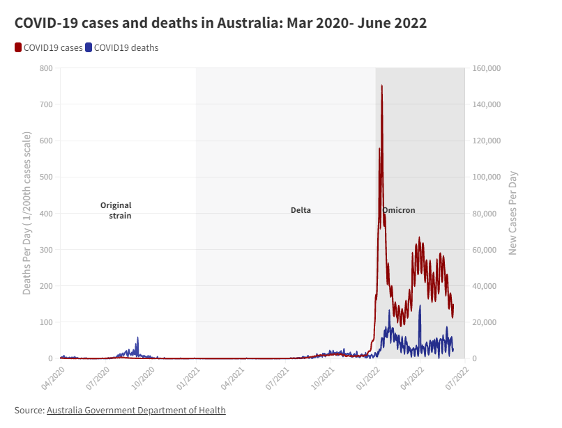 The total COVID-19 death count is much higher than influenza though because the omicron waves have been so highly transmissible – at least a 1/3 Australians have been infected so far in 2022. The current BA5 wave’s hospitalizations are near the January peak, and so the death rate is likely to follow that also.