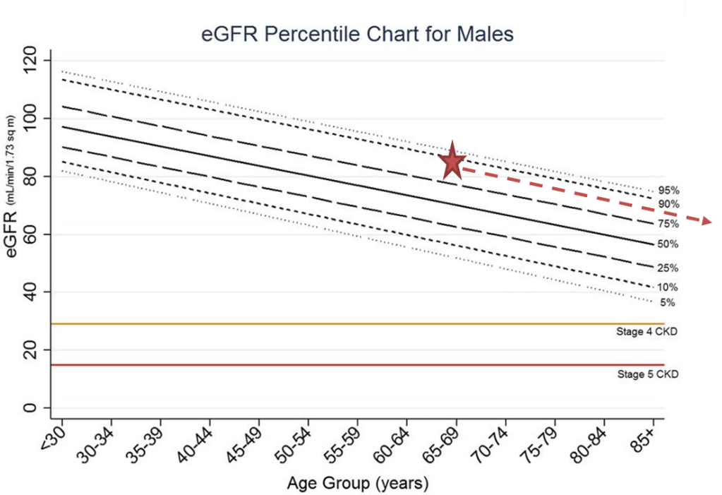 When should I expect that this to happen? To help answer this, we recently developed kidney trajectory charts which plot percentiles of function with age. My current kidney function is marked (red star) on the plot below. If I stayed on the same percentile (dotted arrow), I would expect to develop stage 3a chronic kidney disease sometime in my 90s – assuming I am still alive. And I might be looking at dialysis sometime in my 130s – though I suspect I won’t need to worry about that.