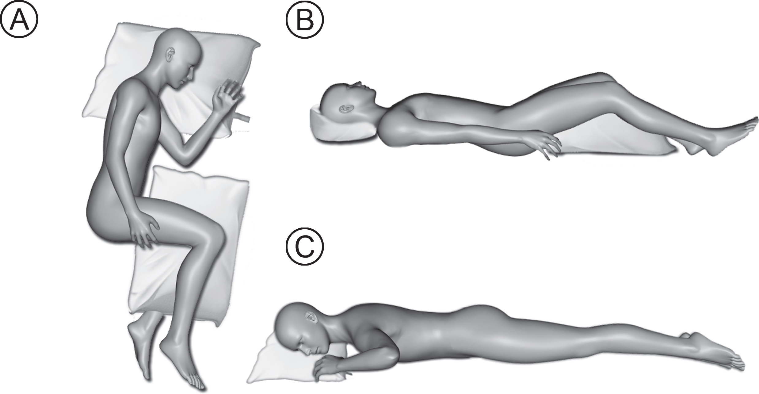 Fig.1 Recommended sleeping positions and pillow orientation (Recommended A – lateral position with pillow between knees; B – supine sleep position with pillow under knees). Not recommended – prone sleep position (C –prone sleep position). https://journals.sagepub.com/cms/10.3233/WOR-152243/asset/f2bae197-3916-4910-94df-a512f5c9b224/assets/graphic/10.3233_wor-152243-fig1.jpg
