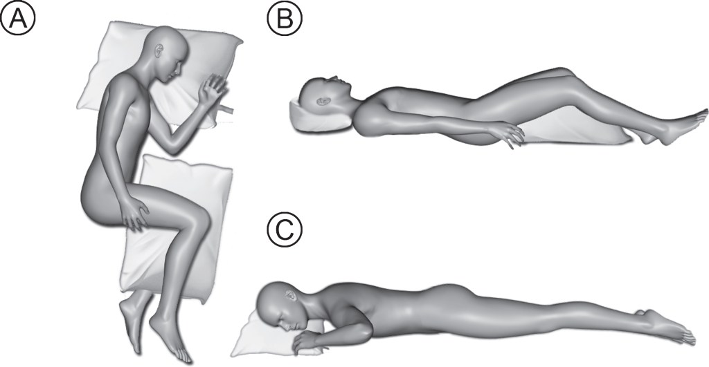 Prior to my operation, I had learned the value of using a pillow between my knees (see Figure position A) but subsequently added a very small pillow between my lower ribs and pelvis to help keep my spine more level. Furthermore, concerned about possible shoulder pain, I learned to sleep on my back – at first just with daytime naps and later adding it as an alternative position to not sleeping. This has definitely reduced my morning pain and stiffness.