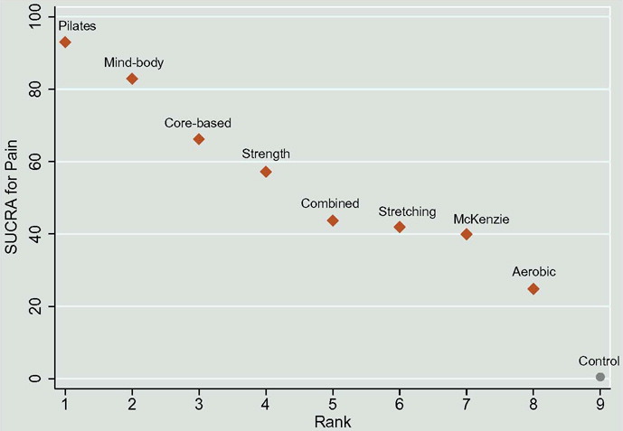 FIGURE 4. (From Fernández-Rodríguez 2022) Ranking for each intervention on pain (SUCRA: surface under the cumulative ranking curve)